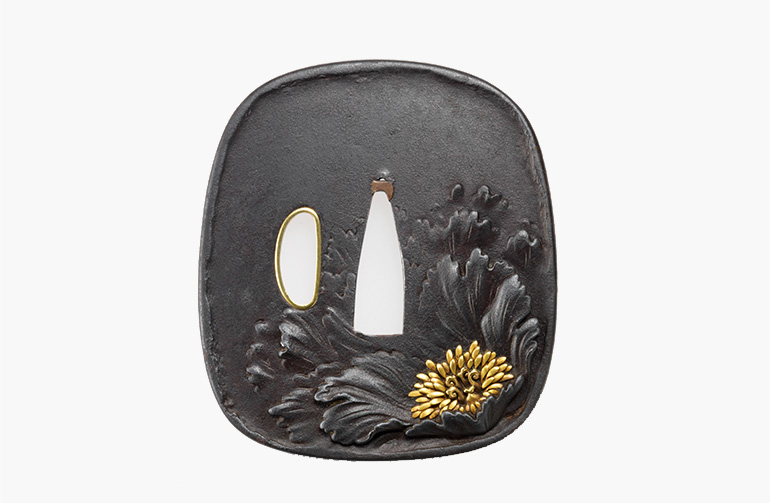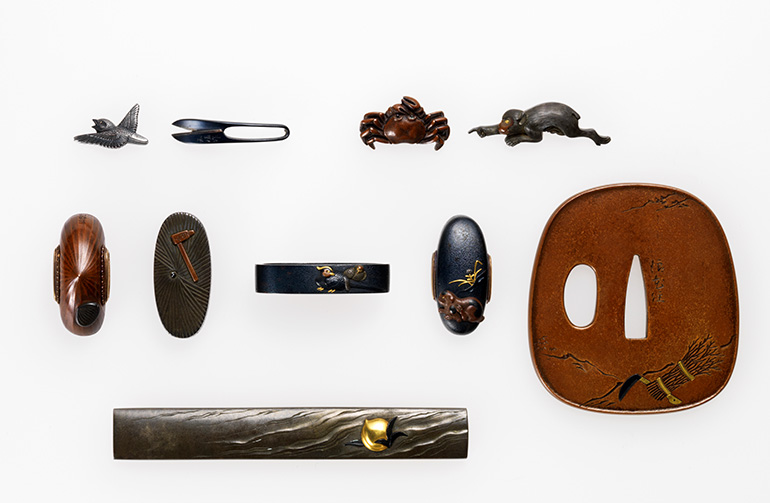 「桃太郎」「猿蟹合戦」「舌切り雀」といったおとぎ話を題材としたカワイイ刀装具。作者の小川知恒は大坂の装剣金工で、現存する作品は非常に少ない。コレクションにはこのような希少作例が多く含まれており、資料的価値も高い。