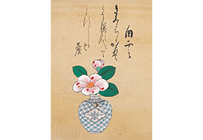 近世初期の園芸椿ブームを背景に制作された「百椿図」。このたびは、椿を意匠とする漆器や陶磁器とともにご覧いただきます。