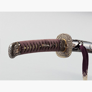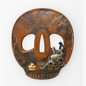 髑髏(どくろ)の形が印象的な鐔。打掛の地獄模様と髑髏がそれぞれ象徴する、遊女・地獄大夫と一休宗純をめぐる話は当時人気の画題であった。府川一則(二代、1855~1919)は東京の金工で、内国勧業博覧会等での受賞も多い。