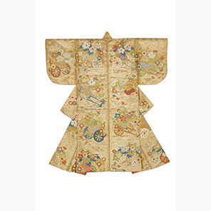 八重の枝垂桜に花車を組み合わせた大ぶりの模様を、段ごとに向きを変えてあらわしている。唐織は能装束の中でもとりわけ豪華なものが多いが、ことに平金糸を全面に織り込んだ総金地の本作は、絢爛さと格調の高さを兼ね備える。