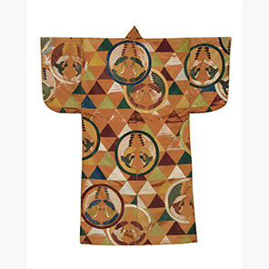 鱗文と向い鳥丸文を、大胆な色づかいで大きく繡いあらわした能装束。渡し繡の技法や袖幅が身頃よりも狭い形態は、桃山時代から江戸時代初期の小袖の特徴を示す。表着の下に隠れる着付でありながら全面に凝った刺繡が施されている点が心憎い。初公開。