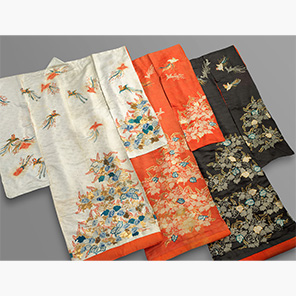 多様な織と繡(刺繡)は、染織品の加飾技法の中でも古くから日本では格式高いものとして捉えられました。また時代がくだると、刺繡は染と組み合わせられて小袖を彩り、重厚な織は能装束に多用されました。