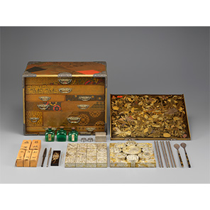 箪笥の全面に施された研出蒔絵はもちろん、金工にも当時最高の技術が用いられ贅を尽くした大名道具。薬種そのものは遺っていないものの、美麗な銀の合子をはじめ数多くの内容品も収められる。本展でその全容を披露する。