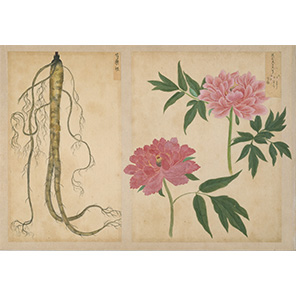 博物大名として有名な高松藩5代藩主・松平頼恭(よりたか)の命により、藩に仕えた平賀源内も関わり制作されたという博物図譜13帖の内のひとつ。対象の特徴を良く写した彩色の美しい植物図譜は全部で7帖あり、モチーフや表現において「百草蒔絵薬箪笥」と密接な関わりがうかがえる。