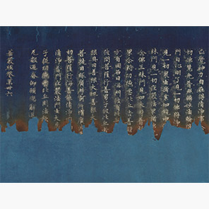 六〇巻本の「華厳経」を書写した二月堂焼経は、奈良時代の現存する唯一の紺紙銀字経である。この1巻は、火災にあいながらも巻首から巻末まで本紙が揃っている点も大変貴重である。