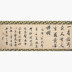 中国僧無学祖元が、その教えを正しく受け継いだ証として日本僧一翁院豪に法衣を授け、それを宗教的な詩である偈に詠んだもの。中国・宋時代の書風を伝え、無学の遺墨のなかでも優品である。