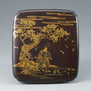 明治39年(1906)初代嘉一郎は、大阪平瀬家の第2回の売立で、前評判の高かったこの硯箱を手に入れるため大阪へ出向いた。破格の高値は収集家としての根津嘉一郎の名を世に知らしめた。