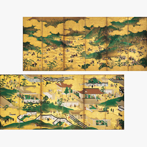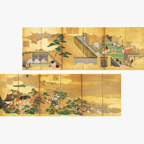 右隻は「若菜上」巻に語られる源氏40歳の祝いの場面、左隻は「若菜下」巻で源氏が紫の上とともに住吉を詣でる場面。柏木と女三の宮の密通によって物語が暗転する直前の源氏の幸せを華やかに描きだしている。