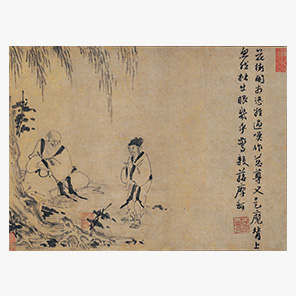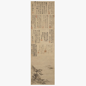 詩と絵からなる一幅は、詩画軸とも呼ばれる。大岳周崇(だいがく・しゅうすう )をはじめ、12人もの禅僧がこの絵を鑑賞し、詩を寄せた。静かな山あいの水辺にひっそりと建つ茅葺きの粗末な小屋。隠逸思想 のもと、彼らにとって日常を離れた理想の情景が描かれている。