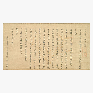 中国僧・剣門妙深(けんもん・みょうしん)が同門で京都・東福寺開山の円爾(えんに)に書いた手紙。共通の師である無準師範(ぶじゅん・しばん)の訃報と遺言を述べている。円爾が帰国してからも、師弟間の交流が続いていたことがうかがえる。