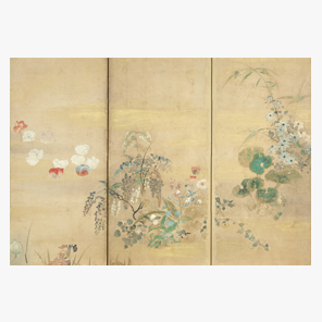 江戸初期の園芸趣味をうけ、多種多様な草花を描く屏風を生みだしたのは俵屋宗達の工房だった。本作品は宗達の2世代後の後継者、喜多川相説ないしはその工房の作。