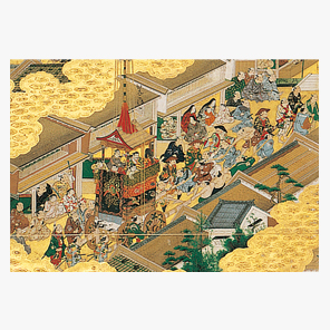 京都の市街(洛中)と郊外(洛外)の景観を鳥瞰(ちょうかん)的に描き、そこでの人々の営みを細やかに描き込む。とくに、祇園祭の山鉾(やまほこ)巡行と神輿(みこし)渡御に描写のウエートが置かれる。