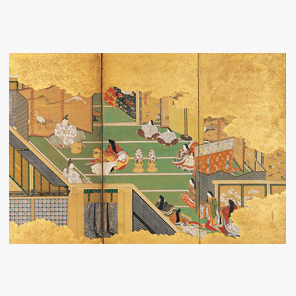 『源氏物語』に取材する六曲一双屏風の右隻、光源氏40歳の祝いの場面。人生の絶頂にある源氏を、妻や娘たちが祝福する内容の小ぶりの屏風は、婚礼調度と思われる。