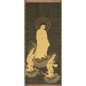 この世で善業(ぜんごう)を積んだ者が死を迎えるとき、阿弥陀如来は、観音菩薩、勢至菩薩とともに現れ、死者の魂を蓮華に載せて西方(さいほう)浄土へと運ぶ。ほとけたちの柔和な表情が、死の恐怖から、極楽往生の喜びへと誘う。