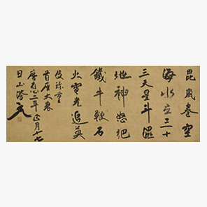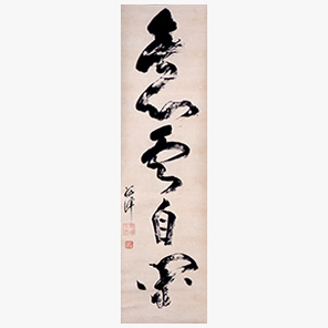 土佐藩山内家の9代藩主豊雍は、不白に茶道指南を命じて江戸藩邸に迎えた。この一行書は、明治25(1892)年に山内家の高知散田邸に所在した品々を記した『御道具根居』に記載が確認でき、山内家に伝わったことがわかる。不白と山内家を繋ぐ重要な一点である。