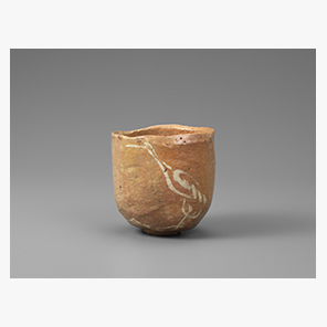 やや細身で高めの半筒形の茶碗に、首を高く伸ばした鶴が白土で描かれている。鶴の姿は不白が好んで描いた鶴絵と同じで、動きのある姿を見せている。黒釉の亀絵茶碗と一双に作られたものである。