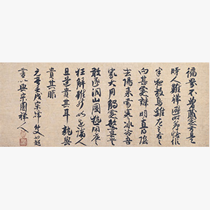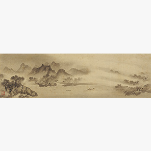 南宋の画僧・牧谿が中国江南の景勝地を描いた「瀟湘八景」のうちの一図。江南地方特有の湿潤な空気と夕暮れの光を、水墨の濃淡のみで劇的に描いた名品で、足利義満の所蔵印が捺される。牧谿画は日本の画人に多大な影響を与え、水墨画の規範となった。