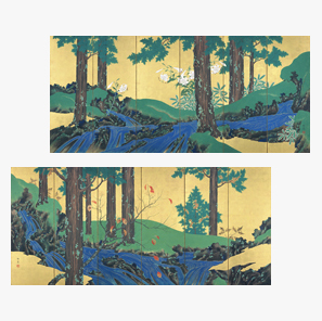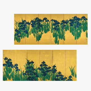 大画面に堂々と、かつリズミカルに描かれ、圧倒的オーラを放つカキツバタの群生。発色の良い上質な群青や緑青のふんだんな使用も、その印象を強めている。尾形光琳(1658〜1716)が画業の最初にたどりついた芸術的頂点である。