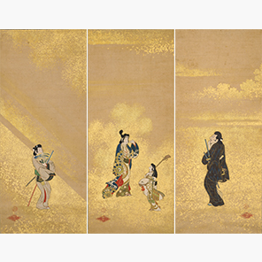 中幅に禿(かむろ)を従えた遊女を描き、向かって右にかぶき者、左に若衆を描く。金泥と濃彩を用いた衣装や、金切箔や砂子を多用した背景装飾は、桃山時代の遺風を継いでいる。生き生きとしたその表情は、近世初期の風俗画の中でも秀逸な出来栄えを示す。