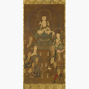 上部に釈迦如来をあらわし、奈良・興福寺と薬師寺を本山とする法相宗の教主である弥勒とともに、法相の祖師たち11人を描いた曼荼羅。インドの著着、世親、中国の玄奘三蔵、慈恩大師、日本の玄昉らが左右に配され、法相宗の仏法の継承を視覚的に表している。