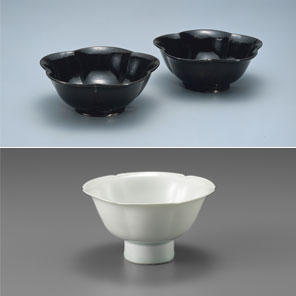 北宋時代の素材違いのほぼ同形の器。口縁を輪花のかたちにつくることは金属器にも見られ、漆器も磁器もそれを写して制作されたと考えられている。いずれも胎が非常に薄くつくられており、洗練されたフォルムには緊張感がみなぎる。