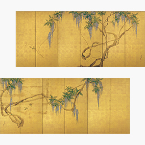 「燕子花図屏風」と共に、酒宴の花として飾られたのが、写生画派の祖・円山応挙による本屏風である。同じ総金地でありながら、色鮮やかな花房と一気呵成に描かれた藤蔓は、「燕子花図」と対照的に洒脱な美を誇る。