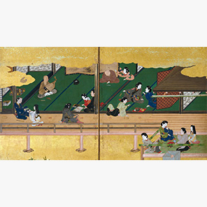 鹿革の鞠を蹴り、回数や姿勢の美しさを競う蹴鞠は、公家が屋外で楽しんだ代表的な遊び。飛鳥井流などの流派が形成されるほど、蹴鞠の技は高められた。本作品は満開の桜の木の下、邸前の庭で行われる蹴鞠の様子を描く。