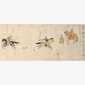 鳥羽院の寵愛した美女・玉藻前が、実は二尾をもつ老狐が化けたものとわかり、これを退治する物語。上総介・三浦介の両人が、狐をしとめるための武芸を磨く。先端にカバーを付けた矢で、馬上から犬を負う犬追物は、12~16世紀に武士たちが盛んにおこなった。