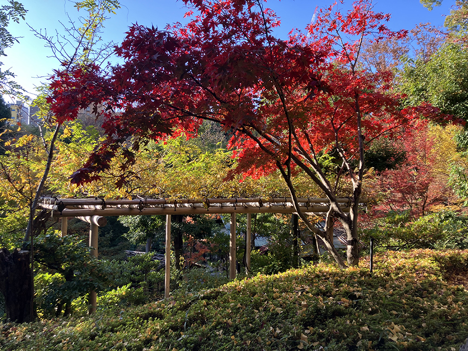 披錦斎の「錦」は、色とりどりの紅葉を意味します。額字は二代根津嘉一郎が揮毫しました。初夏の青葉も楽しめます。